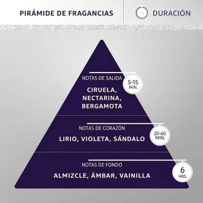 Fragancia Floral Afrutada: Una mezcla suave y encantadora de notas de durazno, lirio y pimienta rosa, que se hace irresistible.