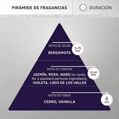 Fragancia Floral Completa: Notas altas de bergamota, corazón de jazmín, rosa, tuberosa, violeta y lirio de los valles, con fondo de cedro, pachulí y vainilla.