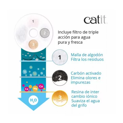 Filtro de Triple Acción: Elimina impurezas, pelos y residuos, reduciendo olores y minerales perjudiciales como calcio y magnesio.
