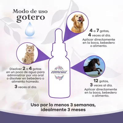Perros: Administrar de 4 a 7 gotas, 4 veces al día directamente en la boca, en el bebedero o con el alimento, por al menos 3 semanas, idealmente 3 meses.