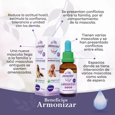 Consejo Profesional: Las Esencias Florales para Armonizar son ideales para ayudar a las mascotas a superar momentos de angustia emocional, tensiones o conflictos. Esta mezcla natural fomenta la calma, la tolerancia y la paz interior, devolviendo el equilibrio emocional en animales que han sufrido estrés o trauma.