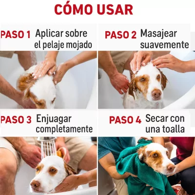 Aplique una cantidad abundante de shampoo sobre la capa húmeda y forme espuma. Masajee suavemente de la cabeza a la cola, evitando los ojos. Enjuague completamente y repita según sea necesario para los desórdenes y olores más difíciles. Cepille la capa para eliminar los enredos y seque bien con una toalla. Las áreas enmarañadas y enredadas pueden requerir atención especial. Se puede aplicar shampoo adicional directamente en estas áreas. Uso solo para perros.