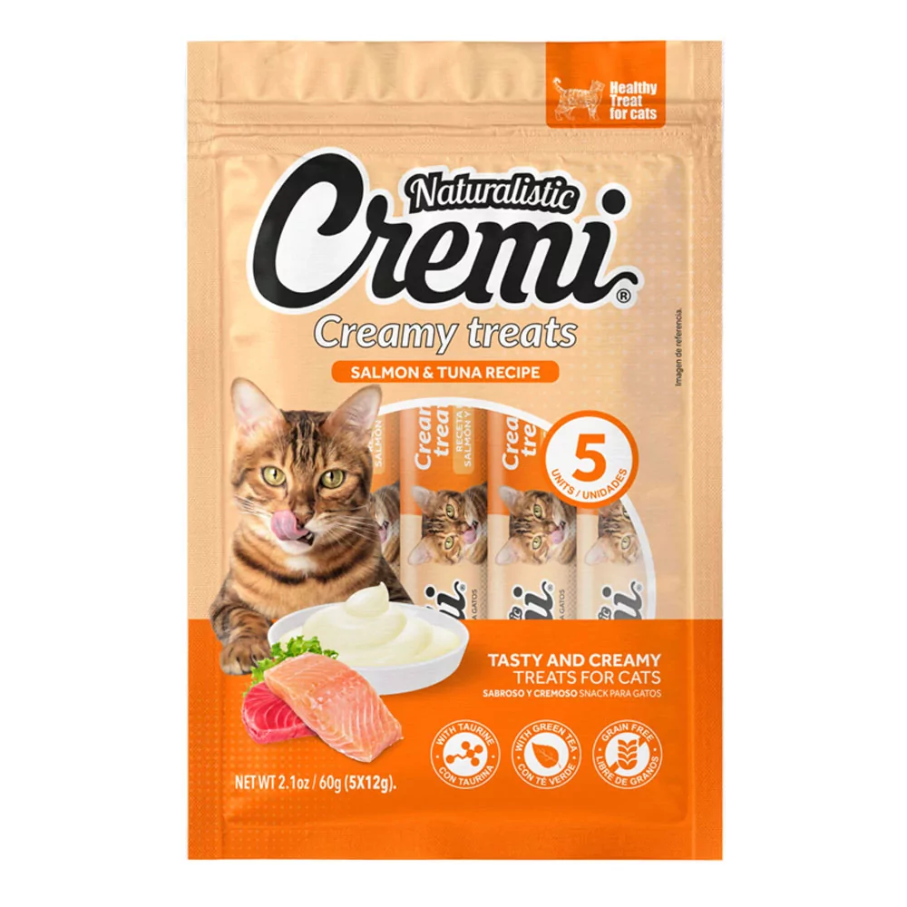 Cremi - Salmón y Atún es un snack cremoso especialmente formulado para gatos de todas las edades, que ofrece una experiencia deliciosa y funcional. Su fórmula combina carne real de pollo y camarones, con taurina (aminoácido esencial para los gatos), y extracto de té verde, conocido por sus propiedades antioxidantes.