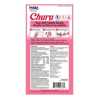 El Churu Snack Húmedo de Atún con Salmón es una deliciosa opción para consentir a tu gato mientras contribuyes a su bienestar. Su textura cremosa, elaborada con atún y salmón salvaje 100 % natural, lo convierte en un premio irresistible y fácil de digerir.