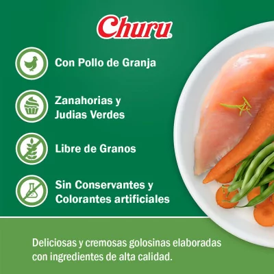Además, Churu es una opción práctica para administrar pastillas, convirtiéndose en una herramienta útil para el cuidado de tu mascota. Su delicioso sabor y su textura suave hacen que sea una recompensa irresistible, perfecta para el entrenamiento o como un toque especial en la dieta diaria de tu perro.