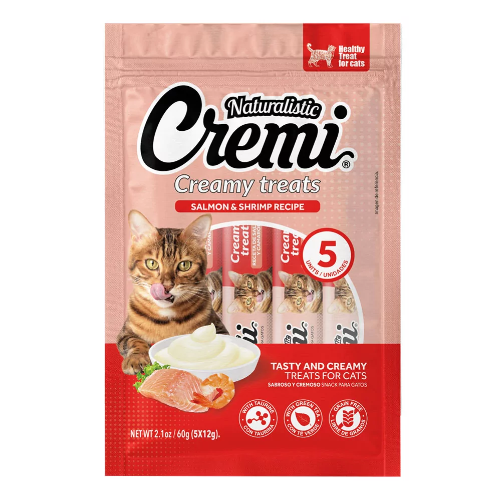 Cremi - Salmón & Camarones es un delicioso snack cremoso diseñado para gatos adultos, formulado con salmón y camarón, reforzado con taurina (un aminoácido vital para la salud de tu gato) y extracto de té verde, que aporta un alto poder antioxidante.
