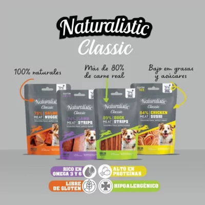 Naturalistic Classic Lamb Strip es un snack funcional, natural y altamente palatable, especialmente formulado para perros con sensibilidad digestiva o alergias alimentarias. Elaborado con un 74% de carne de cordero y pechuga de pato, es una fuente diferenciada de proteína animal, perfecta como premio o complemento entre comidas.