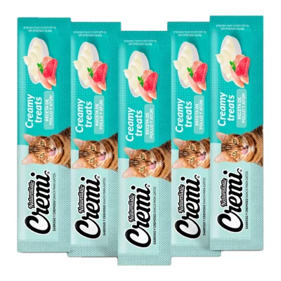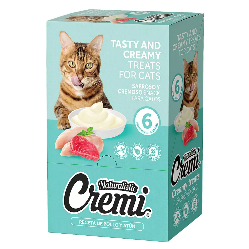 Cremi - Pollo y Atún es un delicioso snack cremoso diseñado para gatos adultos, formulado con pollo y atún, reforzado con taurina (un aminoácido vital para la salud de tu gato) y extracto de té verde, que aporta un alto poder antioxidante.
