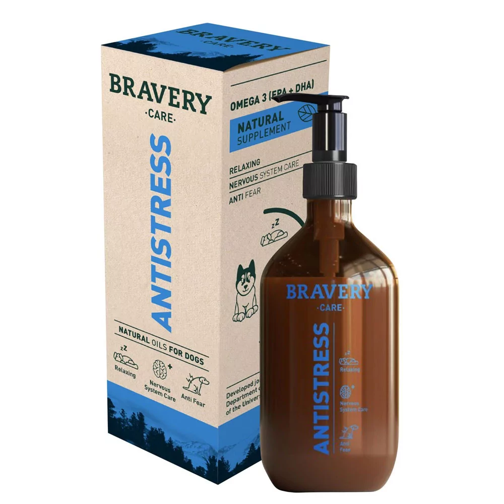 BRAVERY Care Oil Antistress es un suplemento nutricional formulado para reducir el estrés y mejorar el bienestar emocional de los perros. Su base de aceite de salmón noruego, rica en Omega-3, se complementa con melatonina, aceite esencial de hierba limón y extracto de hipérico, ingredientes conocidos por sus efectos calmantes y reguladores del sistema nervioso.
