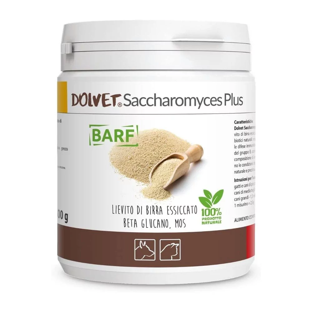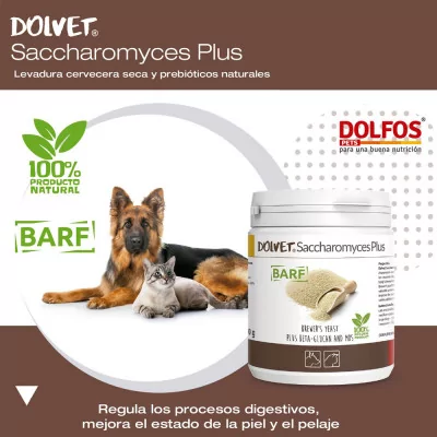 Dolvet Saccharomyces Plu es un suplemento natural diseñado para mejorar la salud digestiva y la apariencia de la piel y pelaje de tu mascota. Este producto contiene levadura cervecera seca (Saccharomyces cerevisiae) y prebióticos naturales como mananooligosacáridos y beta-glucanos, que ayudan a fortalecer la resistencia del organismo.