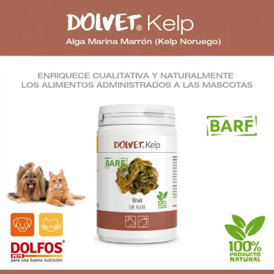 Dolvet Kelp un complemento alimenticio natural que aprovecha las propiedades beneficiosas de las algas marinas pardas Ascophyllum Nodosum y la levadura de cerveza seca. Este suplemento es ideal para enriquecer la dieta de tu mascota, proporcionando nutrientes esenciales que promueven la salud general y el bienestar.