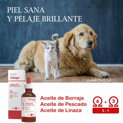 Dolvit Omega es un producto formulado para fortalecer las funciones de la piel en perros y gatos, especialmente en casos de infecciones y caída excesiva de pelo. Su fórmula se distingue por un alto contenido de ácidos grasos insaturados omega-6 y omega-3 en una proporción equilibrada de 5:1. El aceite de borraja es la fuente principal de omega-6, mientras que los aceites de pescado y linaza proporcionan los omega-3 necesarios para la salud de tu mascota.