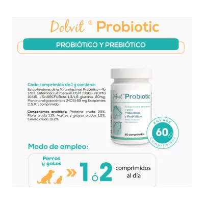 Dolvit Probiotic es un suplemento formulado para mejorar la salud digestiva y restaurar el equilibrio natural de la flora intestinal en perros y gatos. Este producto combina probióticos y prebióticos, ofreciendo una solución integral para mantener un aparato digestivo saludable y funcional.