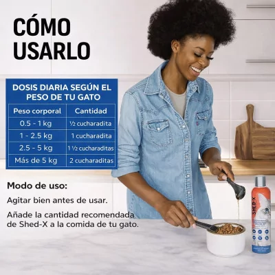 Medir la dosis según el peso del gato, mezclar con el alimento diario hasta que quede bien integrado.