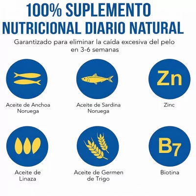 Suplemento nutricional líquido premium ayuda al control de caída de pelo no estacional.